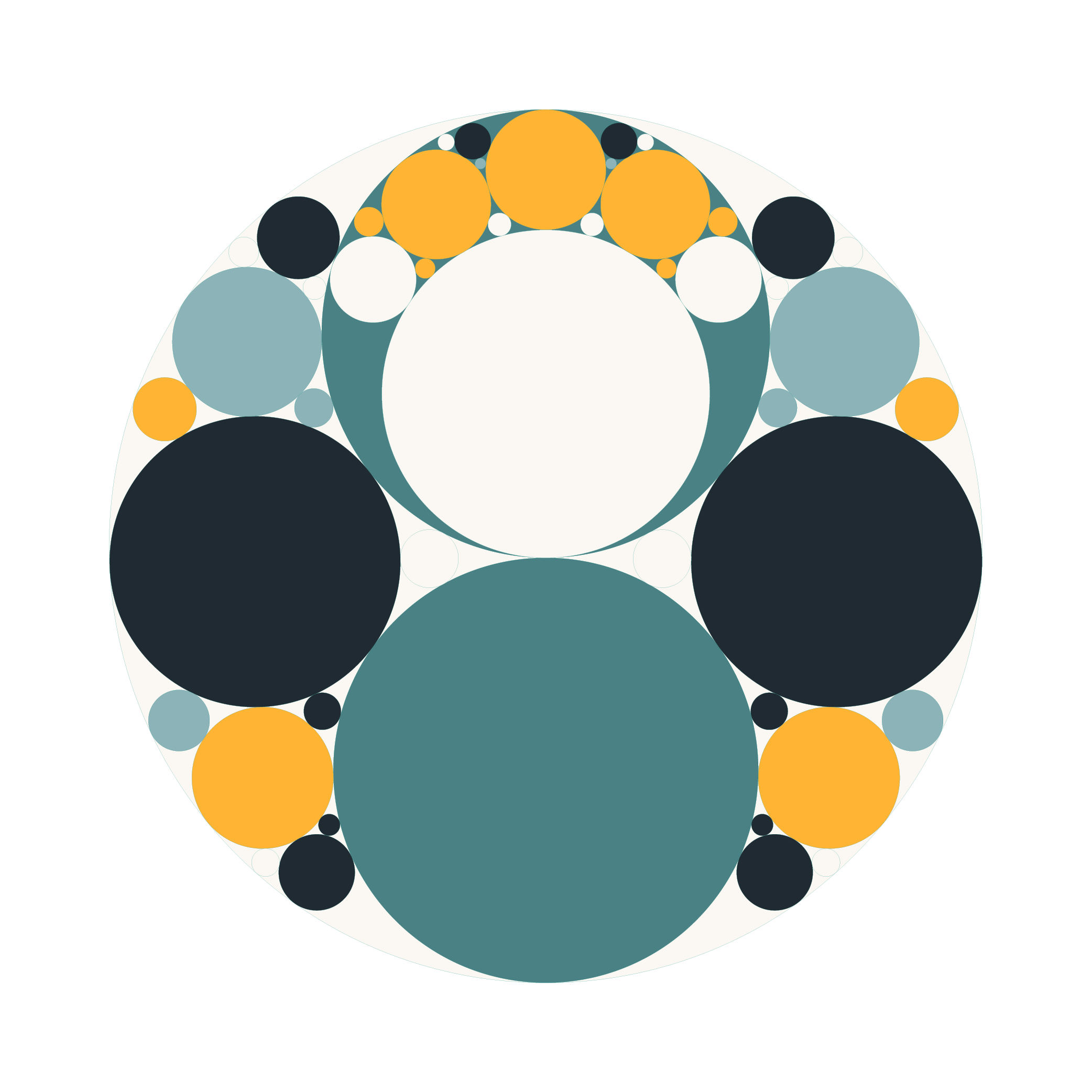 The basic construction randomly partitions circles along their diameter before deterministically packing the remaining space as per Appollonius' problem. Density and partition depth are controlled by each NFT's random seed to create significant diversity between pieces. In addition, there are a number of special topological traits, including but not limited to:
