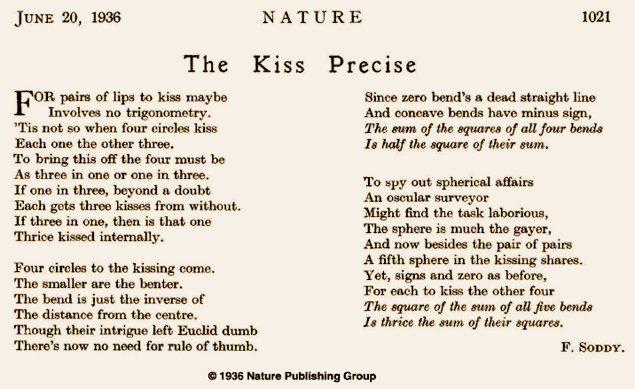 The most famous solution came in the 17th century, in a letter from French mathematician René Descartes to Princess Elisabeth of Bohemia. His elegant algebraic solution (Descartes' Theorem) was also forgotten by history, only to be rediscovered independently by both Steiner and Beecroft in the 19th century. Fifty years later, Frederick Soddy (incidentally a Nobel prize-winning chemist) proposed the solution yet again in poetic form. Published in Nature in 1935, his poem lends its name to our collection. Ever since, the problem has continued to influence cutting edge research in algebraic topology and group theory.